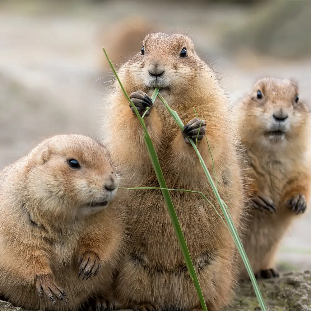 Here in Canada, we share our lands and waters with many different animals. In Saskatchewan, black-tailed prairie dogs are busy digging burrows next to farmland. In northern forests, grey wolves race down logging trails. Off the Pacific coast, sea otters swim while giant ships pass by.