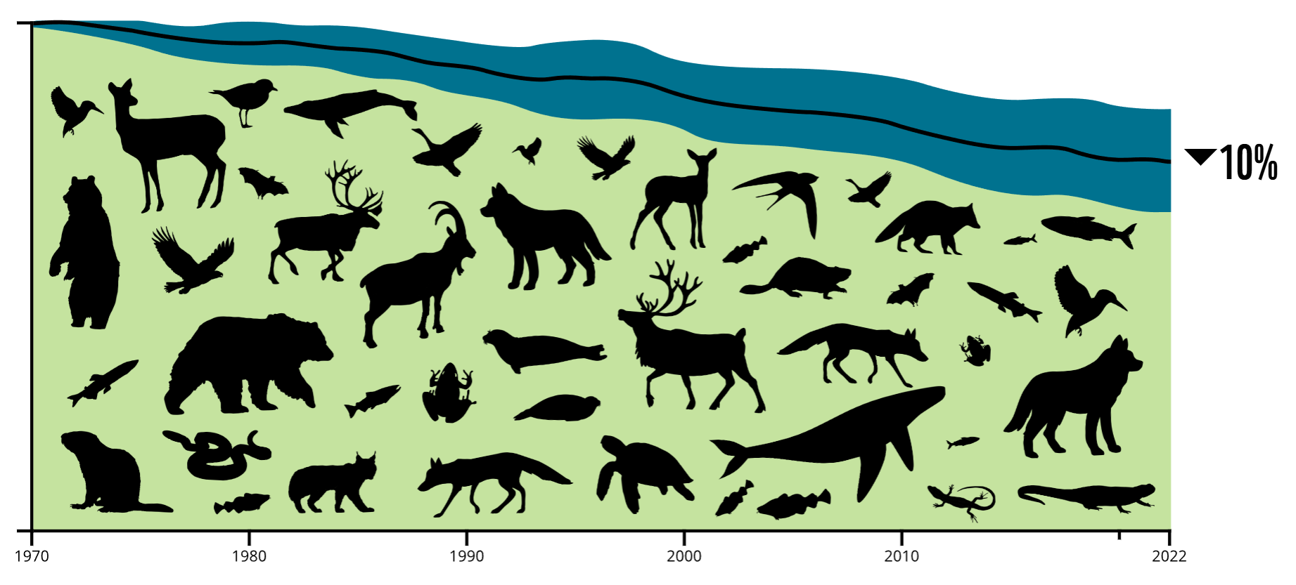 Populations for a lot of wildlife species in Canada are shrinking. How do we know? To find out and create the Living Planet Report Canada, scientists analyzed data on population sizes for 910 vertebrates (A vertebrate is an animal with a backbone. That includes mammals, birds, reptiles, amphibians and fish.)*. Why 910? Because that’s how many animals they had enough data, or information, available for. Between the years of 1970 and 2022, the scientists found that on average, the populations of those species fell by 10 per cent.